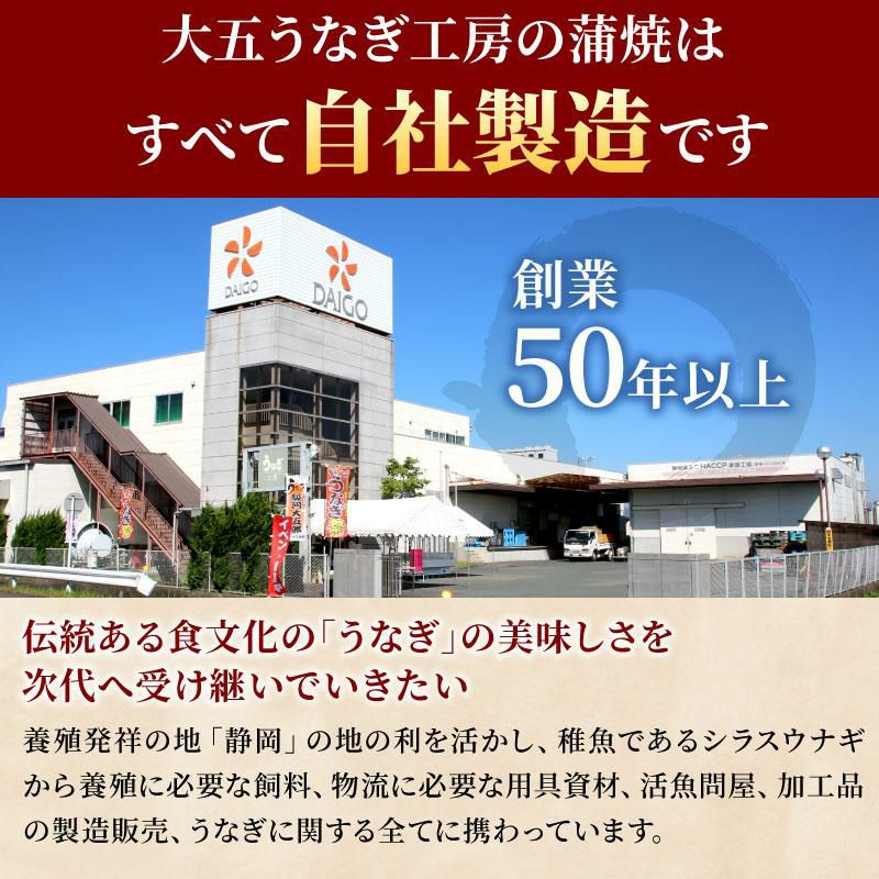 まとめ買いがお得 2尾セット 3尾セット 4尾セット セット内容 年間蒲焼販売数312万尾以上!モンドセレクション金賞受賞 ミシュランシェフ村田料理長監修 厳選した国産うなぎを使用 うなぎ本来の味わいを引き出す、南アルプスの天然水/熟練職人の心と技 3種以上の秘伝ダレ。たまり醤油香るこだわりの味 香ばしく、ふっくら焼き上げました 焼き立ての美味しさ 大五うなぎ工房の蒲焼はすべて自社製造です