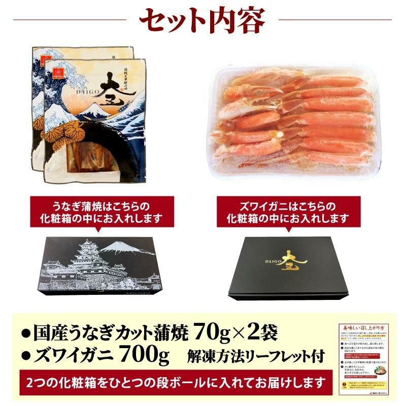 他の画像を見る うなぎ&カニの高級ギフトセット 国産うなぎ蒲焼ハーフカット2パック&生ズワイガニ700gセット 化粧箱付 送料無料 eギフト クール便でお届け 定価 ¥ 13,460 のところ 特別価格 ¥ 9,980 税込 詳細を見る お気に入りに登録する