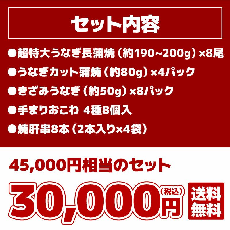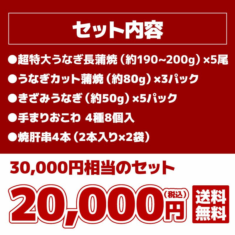 他の画像を見る 30,000円相当!合計1.4kg以上の豪華うなぎ福袋 うなぎ福袋2万円セット 簡易包装 送料無料 クール便でお届け 通常価格 ¥ 20,000 税込 在庫切れ 詳細を見る お気に入りに登録する