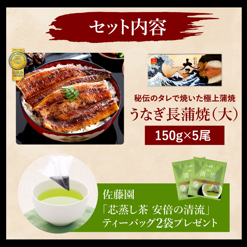 名称 モンドセレクション金賞 国産うなぎ長蒲焼150g 5尾セット 安倍の清流2袋プレゼント付