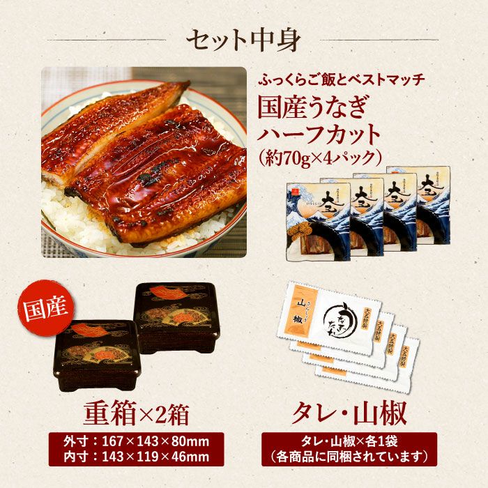他の画像を見る 極上の国産蒲焼を使ったうな重を専門店の雰囲気で 国産うなぎ蒲焼ハーフカット4パック&重箱2個セット 化粧箱付 送料無料 クール便でお届け 定価 ¥ 9,720 のところ 特別価格 ¥ 8,900 税込 詳細を見る お気に入りに登録する