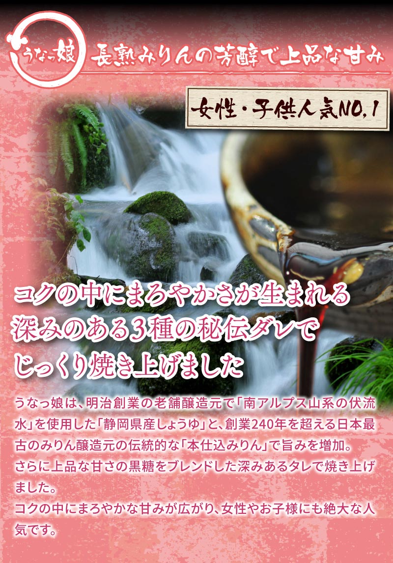 【うなっ娘】 うなぎ(国産・ニホンウナギ)、みりん、しょうゆ(小麦・大豆を含む)、発酵調味料、加工黒糖、砂糖/増粘剤(加工でん粉)