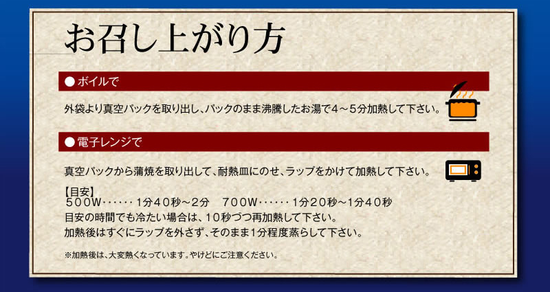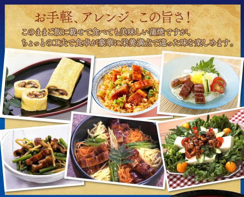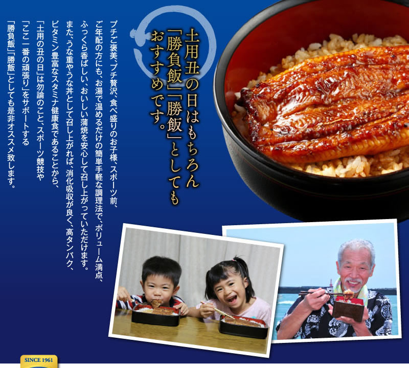 ・プチご褒美、プチ贅沢、食べ盛り育ち盛りのお子様、スポーツ前後、ご年配の方に、大切なあの方にも、お湯で温めるだけの簡単手軽な調理法で、ボリューム満点、ふっくら香ばしい、安心安全美味しい「モンドセレクション最高金賞うなぎ蒲焼セット」を召し上がっていただけます。また、うな重やうな丼、ひつまぶしなどで召し上がれば、消化吸収が良く、高タンパク、ビタミン豊富なスタミナ健康食であることから、「土用の丑の日」は勿論のこと、スポーツ競技や「ここ一番の頑張り」をサポートする「勝負飯」「勝飯」としても是非オススメ致します。