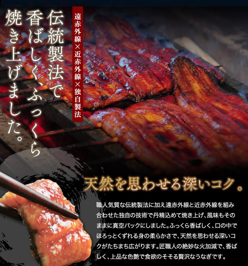 ・職人気質の伝統製法に遠赤外線と近赤外線を組み合わせた独自の技術で焼き上げた香ばしさに加え、中はふっくらとした、あの鰻屋さんの「本格的な蒲焼」を風味そのままに真空パック。