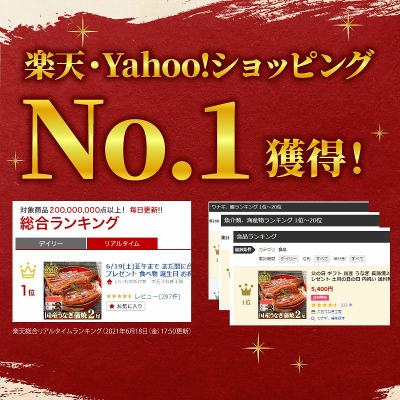 他の画像を見る 楽天市場、ヤフーショッピングで総合ランキング1位! 国産うなぎ 長蒲焼2尾セット 化粧箱付 送料無料 eギフト クール便でお届け 通常価格 ¥ 5,800 税込 〜 通常価格 ¥ 税込 詳細を見る お気に入りに登録する