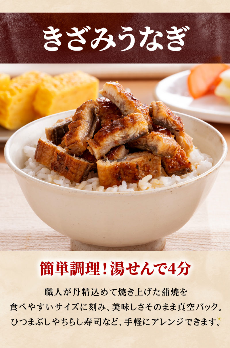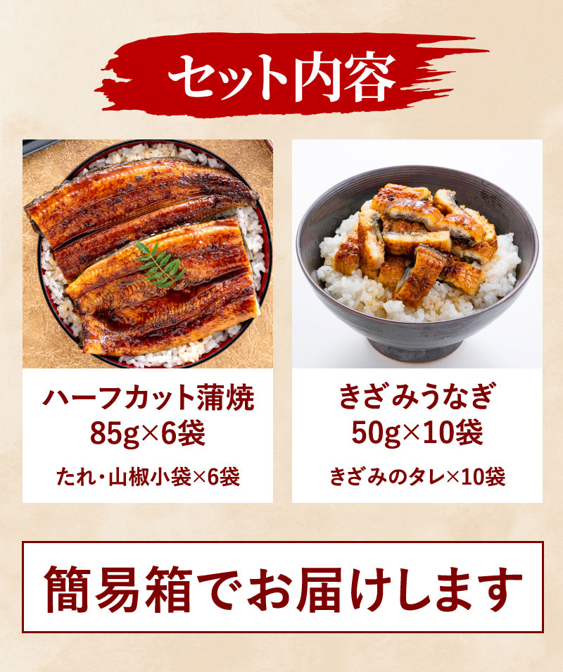 内容量 ハーフカット(重量85g)×6袋、刻みうなぎ(重量50)g×10袋、添付たれ・山椒×16袋、食べ方説明書