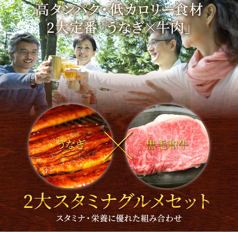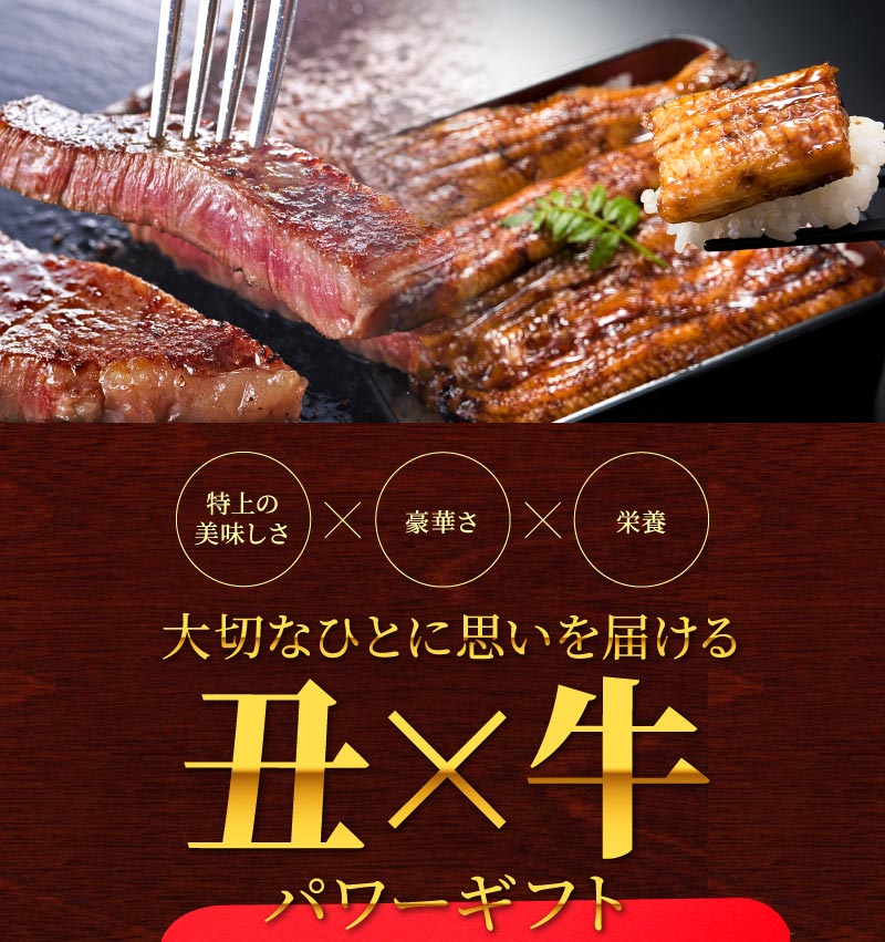 たいせつな人に思いを送る、豪華さと高タンパク低カロリーな栄養機能を兼ね備えたギフトとして最適な、モンドセレクション最高金賞うなぎと国内コンテスト常勝和牛のコラボセットです。その名も「丑牛セット(うしうしセット)」。最高級と最高級が合体したスペシャル感とそれぞれの受賞歴が証明する高品質、そしてネーミングのインパクトで、父の日のプレゼントなどに一味違うギフトとして喜ばれています。