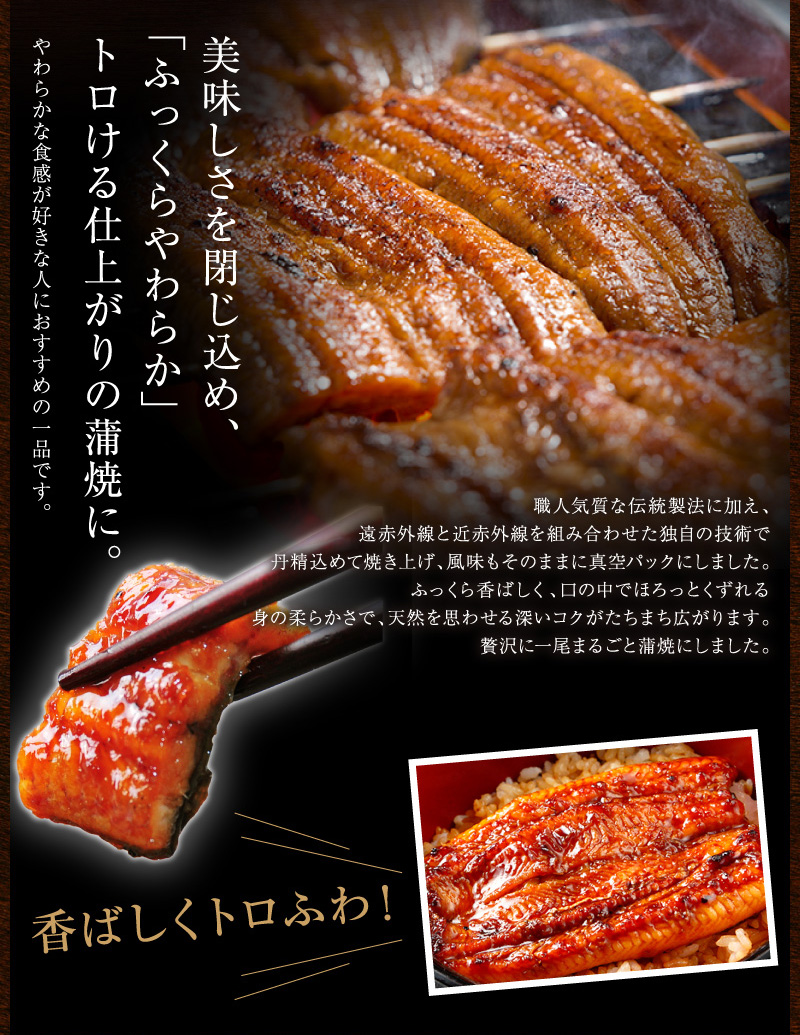 商品説明 ・うなぎはコラーゲンが多いため加熱するほど柔らかくなるのですが、焼き時間を長くすればコゲが発生し、蒸しを長くすると美味しさも落ちてしまいます。やわらか長蒲焼は「特殊製法」により旨味を残しつつ、通常の蒲焼工程よりも長い加熱時間を実現しました。レトルト処理とは違い、程よい食感を残してあります。
