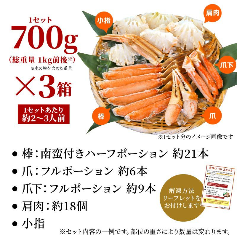 他の画像を見る お刺身OK!流水解凍するだけで食べられる、鮮度抜群の特大生ズワイガニ カット済み 生ズワイガニ 2.1kg(700g×3箱) 化粧箱付 送料無料 クール便でお届け 通常価格 ¥ 25,440 税込 詳細を見る お気に入りに登録する