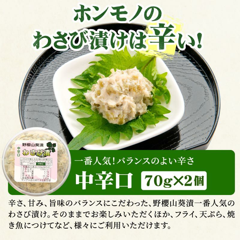他の画像を見る バランスのよい辛さ! こだわり店主の手作りわさび漬け 中辛口70g×2個 野櫻本店 化粧箱付 送料無料 日時指定不可 クール便でお届け 通常価格 ¥ 3,780 税込 詳細を見る お気に入りに登録する