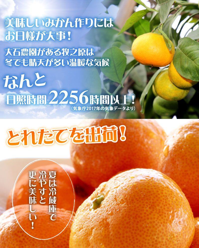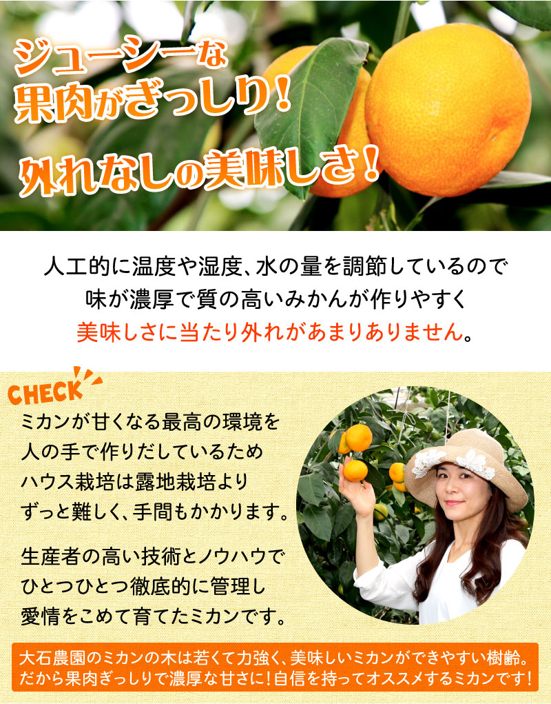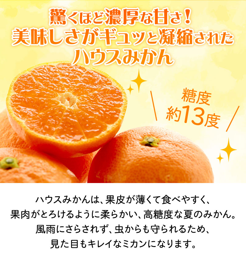 今年も甘くて美味しいみかんができました!ハウスみかんは、果皮が薄くて食べやすく、果肉がとろけるように柔らかい、高糖度な夏のみかん。人工的に温度や湿度、水の量を調節しているので、味が濃厚で質の高いみかんが作りやすく、美味しさに当たり外れがあまりありません。