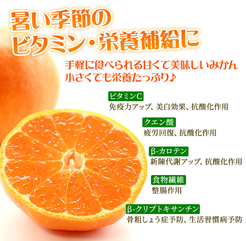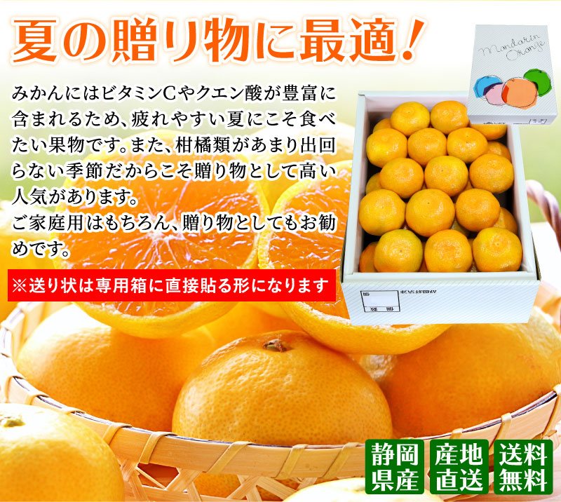 みかんにはビタミンCやクエン酸が豊富に含まれるため、疲れやすい夏にこそ食べたい果物です。また、柑橘類があまり出回らない季節だからこそ贈り物として高い人気があります。ご家庭用はもちろん、贈り物としてもお勧めです。