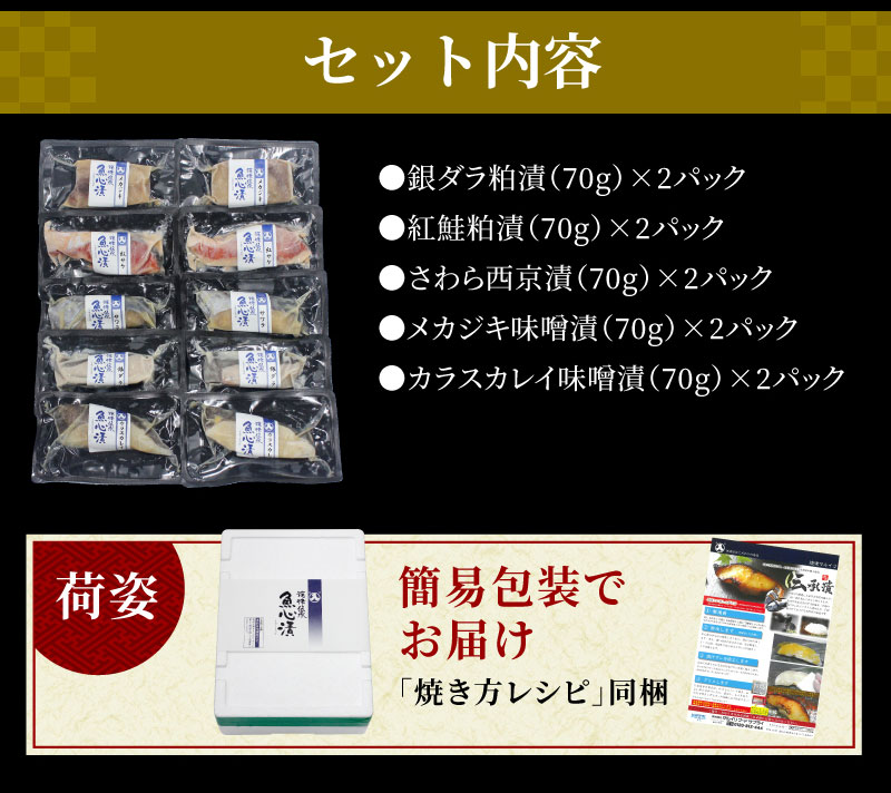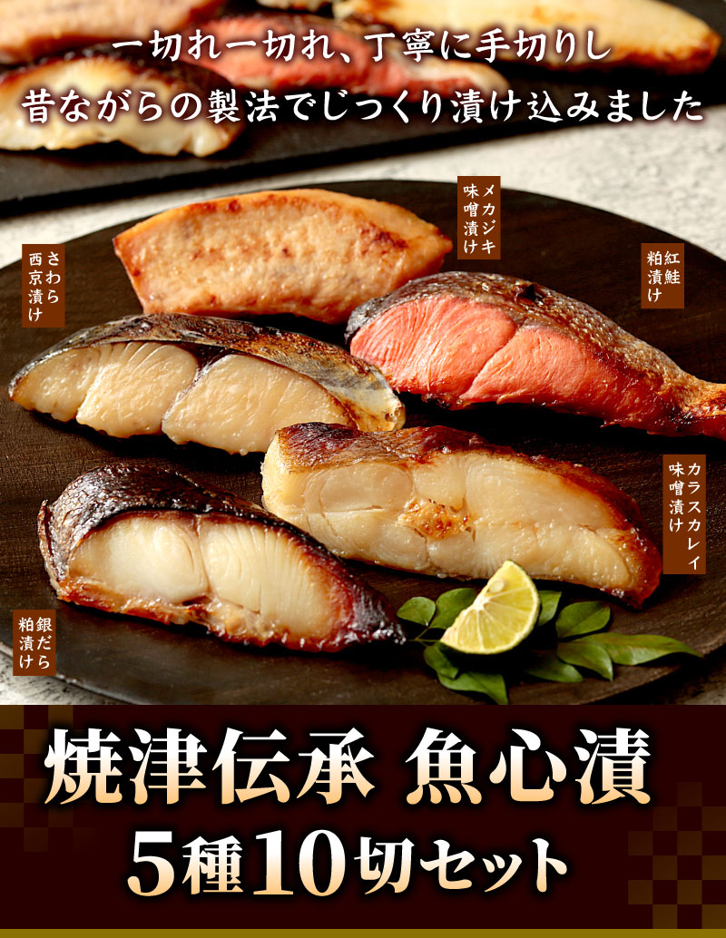 焼津伝承 魚心漬 5種10切れセット[銀ダラ粕漬、紅鮭粕漬、サワラ西京漬、メカジキ味噌漬、カラスカレイ味噌漬]