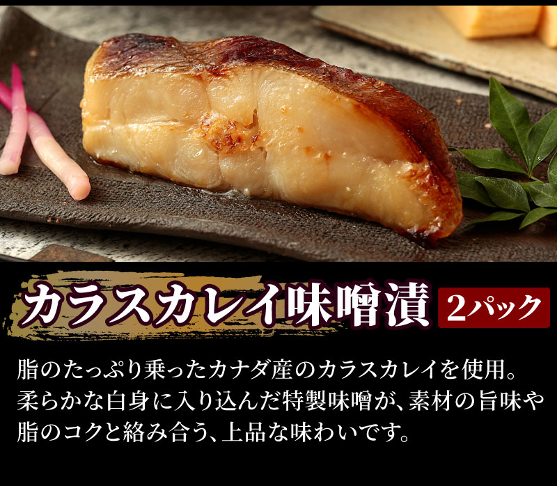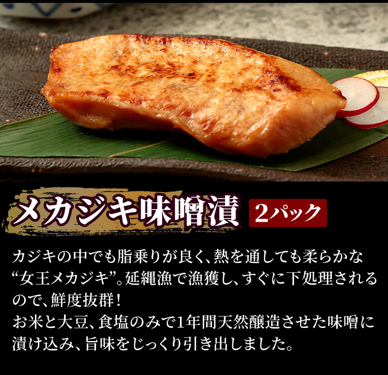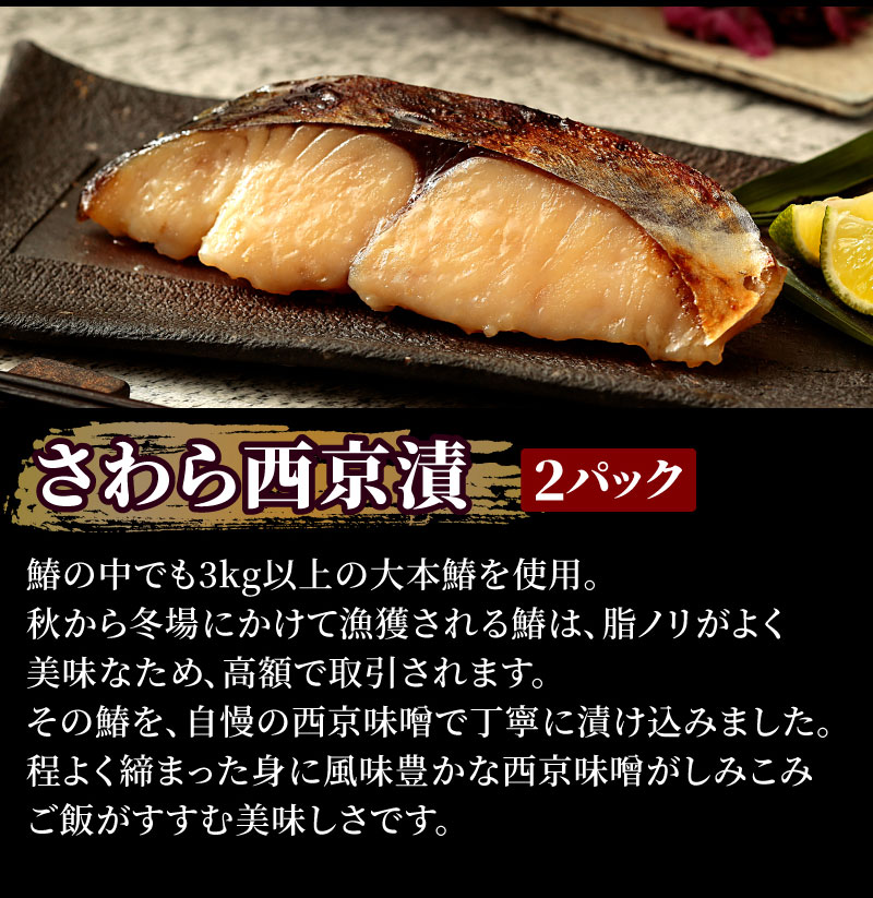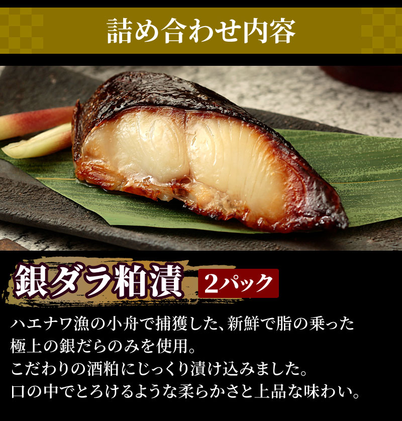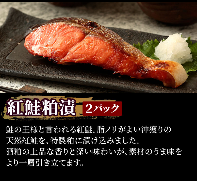 ●メカジキ味噌漬:約70g×2 ●紅鮭粕漬:約70g×2 ●サワラ西京漬:約70g×2 ●銀ダラ粕漬:約70g×2 ●カラスカレイ味噌漬:約70g×2
