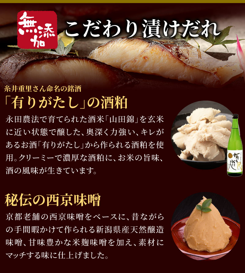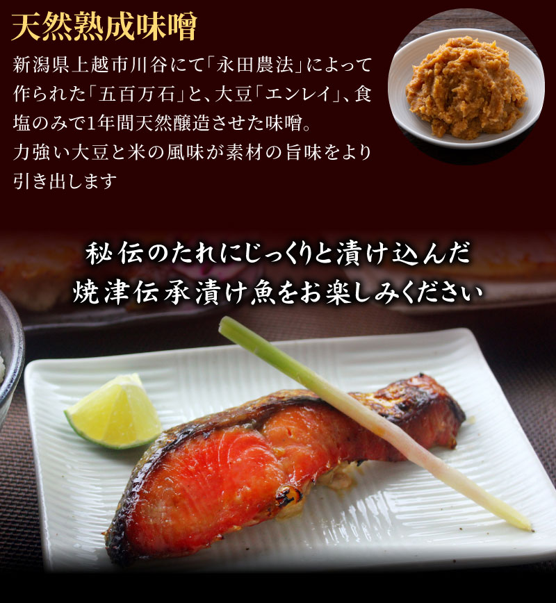 京都老舗の西京味噌をベースに、昔ながらの手間暇かけて作られる新潟県産天然醸造味噌、甘味豊かな米麹味噌を加え、素材にマッチする味に仕上げました。