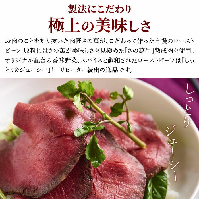 他の画像を見る 肉匠さの萬がこだわって作った自慢のローストビーフ 肉匠さの萬 こだわり仕立て熟成ローストビーフ280g 化粧箱付 送料無料 クール便でお届け 通常価格 ¥ 8,600 税込 詳細を見る お気に入りに登録する
