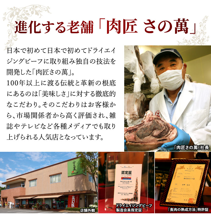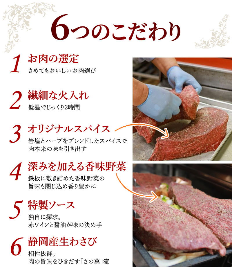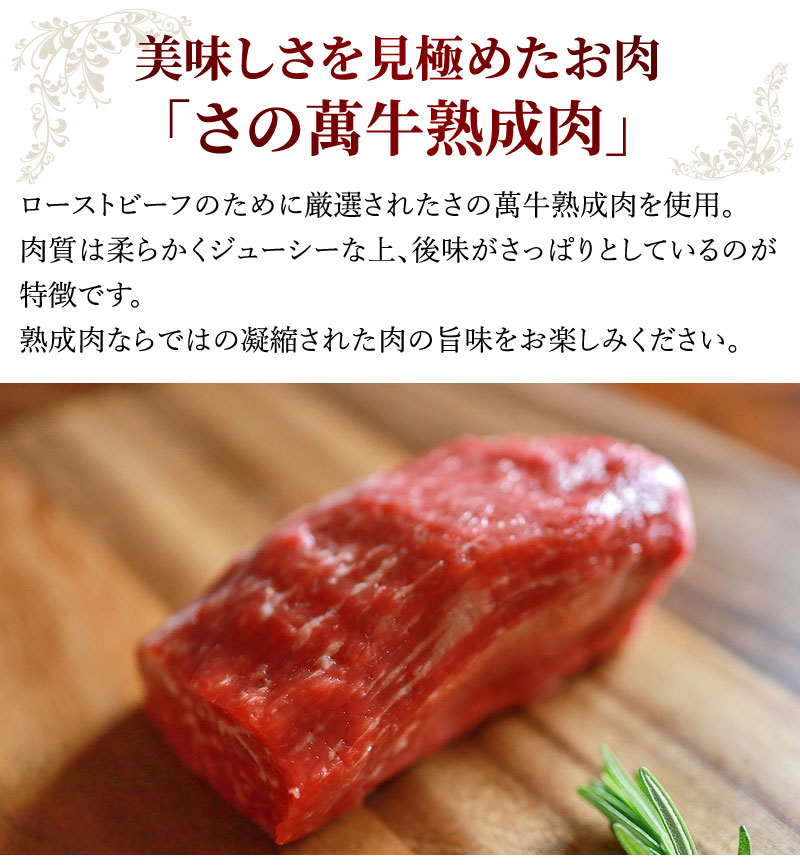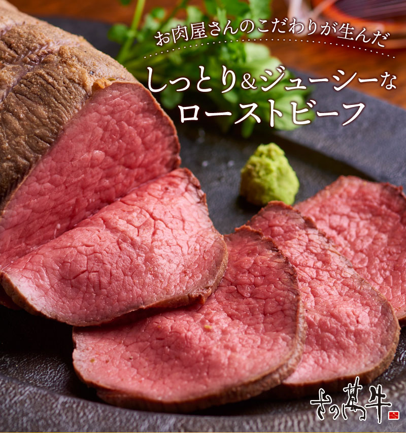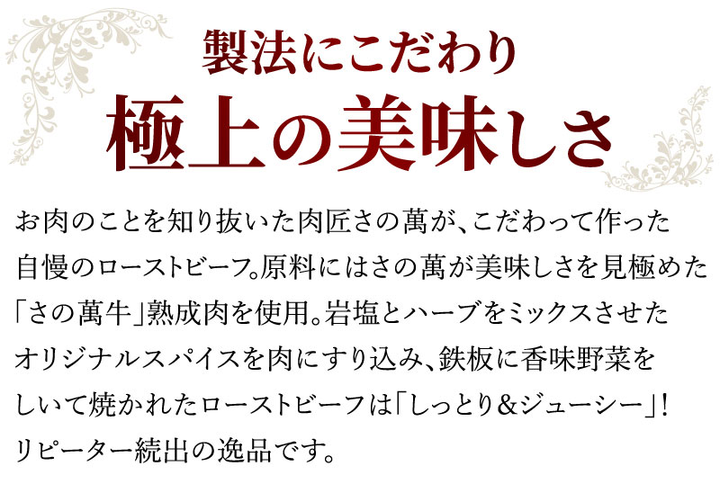 お肉のことを知り抜いた肉匠さの萬が、こだわって作った自慢のローストビーフ。原料にはさの萬が美味しさを見極めた「さの萬牛」熟成肉を使用。オリジナル配合の香味野菜、スパイスと調和されたローストビーフは「しっとり&ジューシー」!