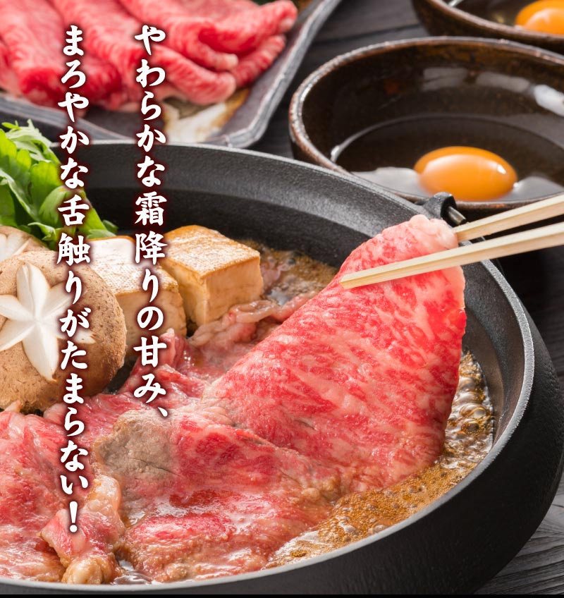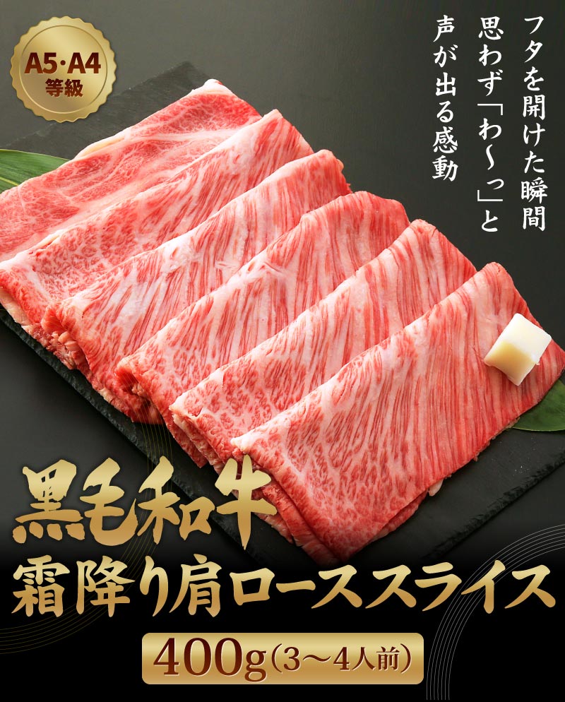 A5・A4黒毛和牛の高級部位、肩ロースを豪華な大判サイズで丁寧にスライス。霜降りのやわらかな食感と濃厚な味わいが特徴で、すき焼きやしゃぶしゃぶにお薦めです。