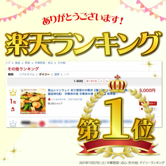 【中華丼の具(塩味)】白菜(国産)、いか、えび、チンゲン菜、人参、竹の子、椎茸、平茸しめじ、赤ピーマン、老酒、砂糖、鶏ガラスープ、食塩、食用植物油脂/増粘剤(加工澱粉)、調味料(アミノ酸等)、(一部に小麦・えび・ごま・いか・鶏肉を含む)