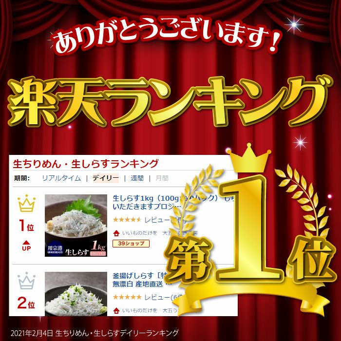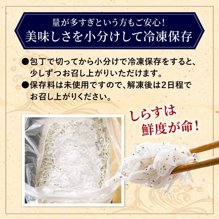 他の画像を見る 用宗港(静岡県駿河湾)鮮度が命の生しらす 1kg(100g×10)【冷凍】 簡易包装 送料無料 eギフト クール便でお届け 通常価格 ¥ 7,280 税込 詳細を見る お気に入りに登録する