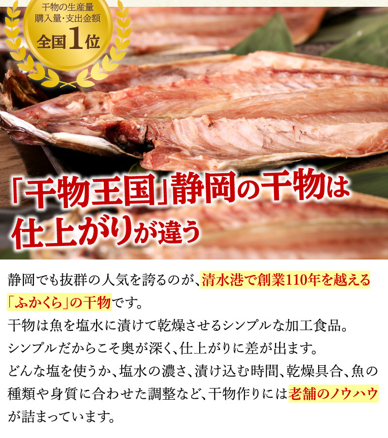 静岡県は干物の生産量全国1位、購入数量・支出金額も全国1位の干物王国です。静岡でも抜群の人気を誇るのが、清水港で創業110 年越える「ふかくら」の干物です。