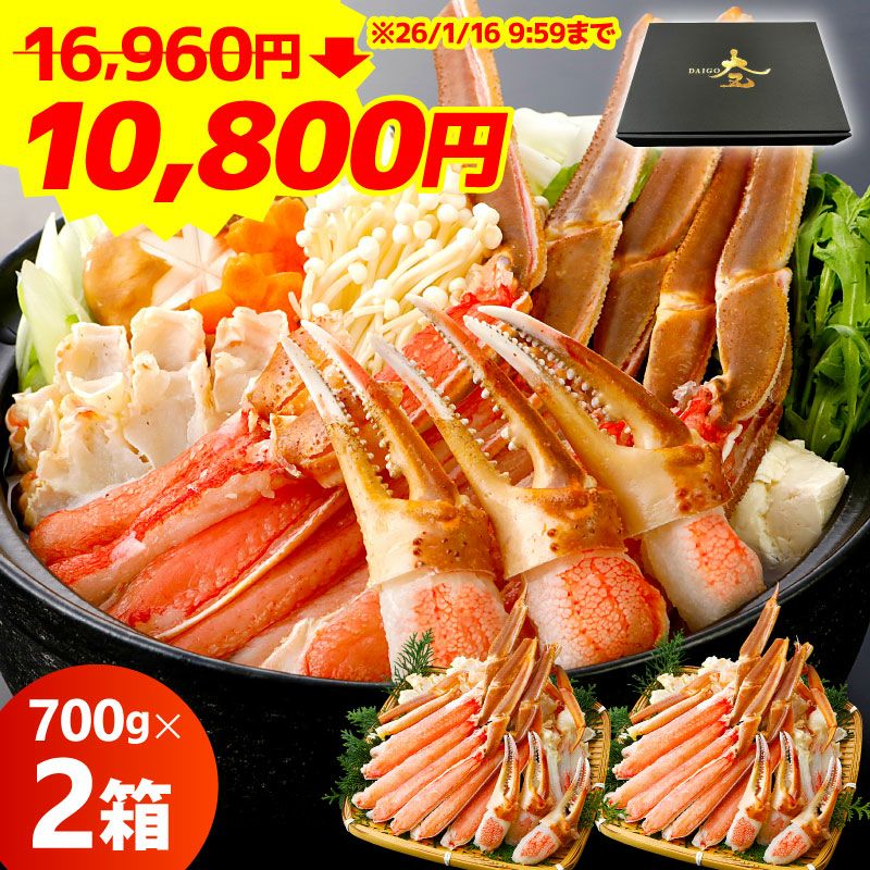 他の画像を見る お刺身OK!流水解凍するだけで食べられる、鮮度抜群の特大生ズワイガニ カット済み 生ズワイガニ 1.4kg(700g×2箱) 化粧箱付 送料無料 クール便でお届け 定価 ¥ 16,960 のところ 特価 ¥ 10,800 税込 詳細を見る お気に入りに登録する