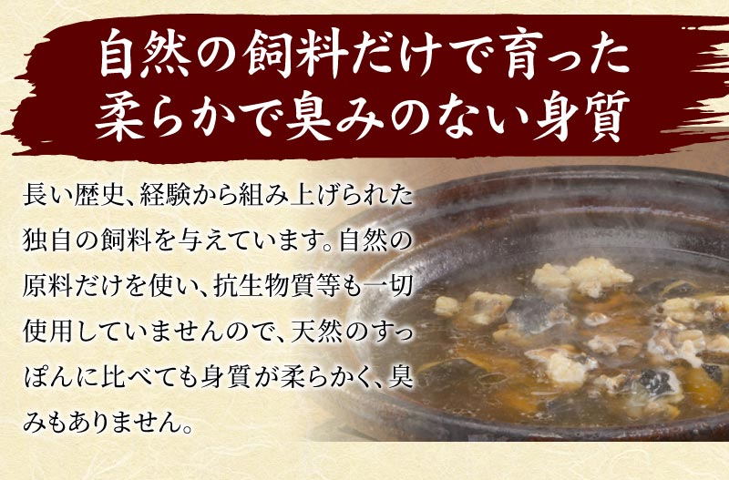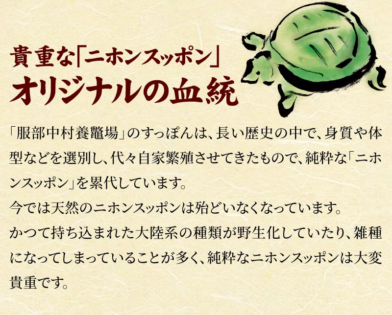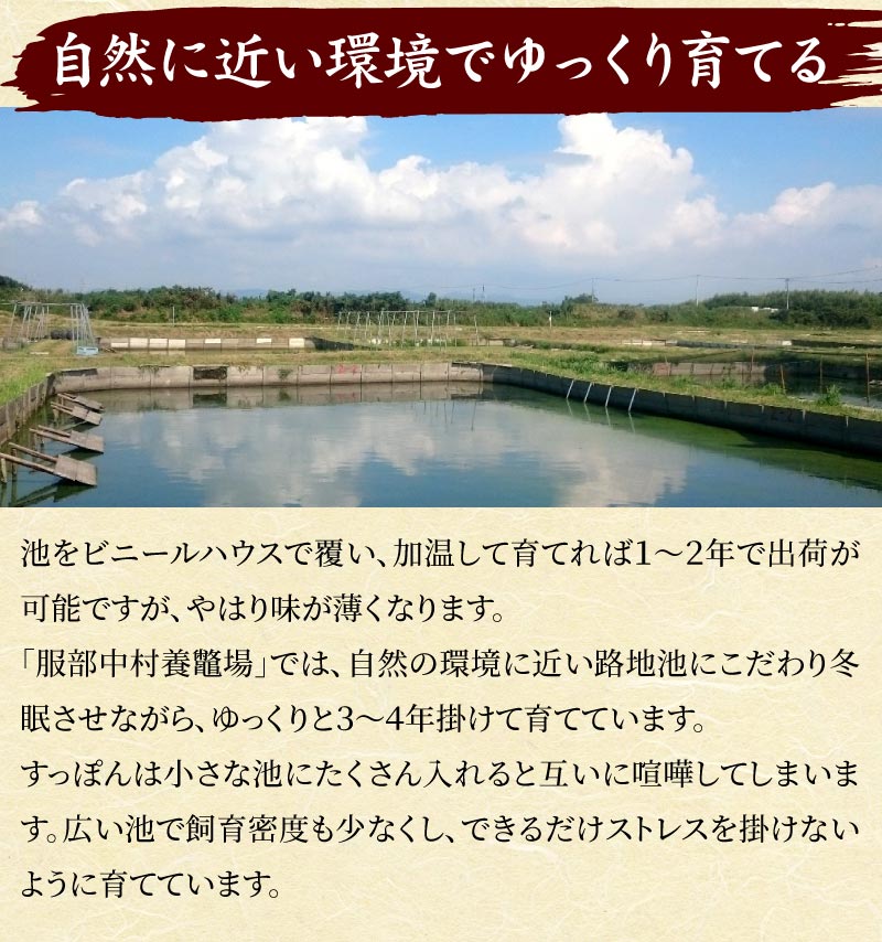 自然の原料だけを使った独自開発の飼料を与え、ゆっくりと3~4年、自然に近い環境で育てているので、天然のすっぽんに比べても身質が柔らかく臭みもありません。良質な脂肪とコクのある味わいを持った「服部のすっぽん」は、全国の高級料理店で高い評価を受けています。