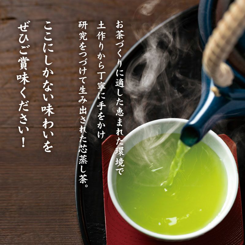 芽伸びの最盛期に摘まれた若芽を、名前のとおり「芯まで蒸す」ことで、渋味や苦味を抑えつつ茶葉が本来持つコクとうま味をしっかり引き出しています。