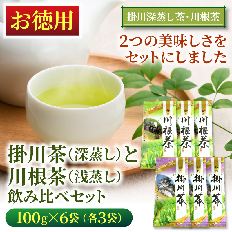 お徳用・飲み比べセット 掛川茶(深蒸し)100g×3袋と川根茶(浅蒸し)100g×3袋