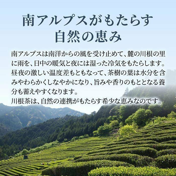 川根茶は同時に「山のお茶」の代表格でもあります。昼夜の寒暖差の大きさや日照条件、湿度など、お茶の旨味を高める自然環境に育まれた「山のお茶」は、お茶本来の自然な香りや旨みが濃厚な高級茶とされています。