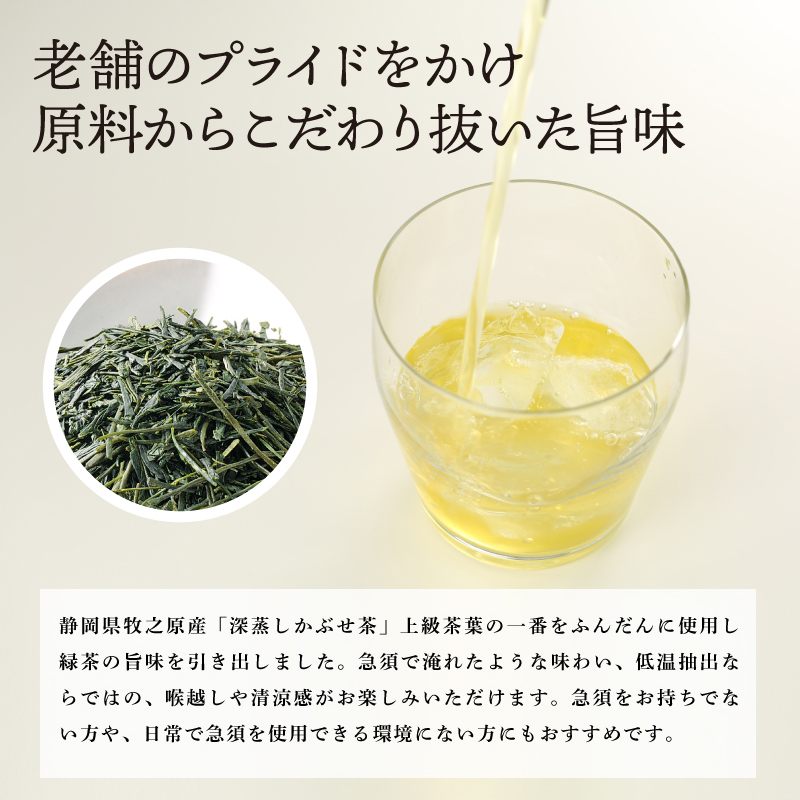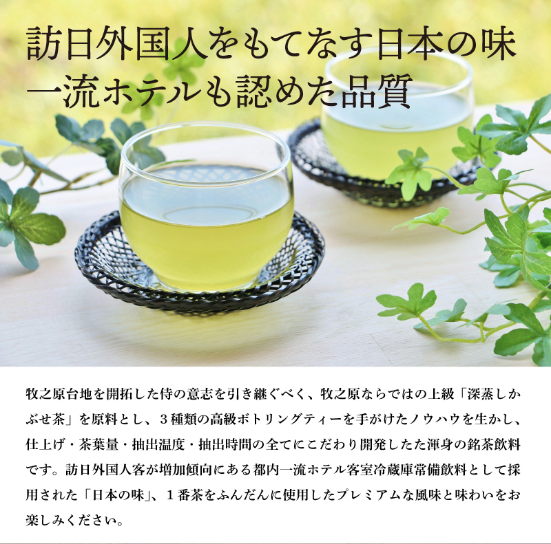 牧之原台地を開拓した侍の意志を引き継ぐべく、牧之原ならではの上級「深蒸しかぶせ茶」を原料とし、3種類の高級ボトリングティーを手がけたノウハウを生かし、仕上げ・茶葉量・抽出温度・抽出時間の全てにこだわり開発したた渾身の銘茶飲料です。訪日外国人客が増加傾向にある都内一流ホテル客室冷蔵庫常備飲料として採用された「日本の味」、1番茶をふんだんに使用したプレミアムな風味と味わいをお楽しみください。