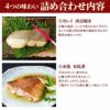 銀鮭 西京焼(焼前 約70g)×1枚、銀ひらす 西京焼(焼前 約70g)×1枚、カレイ 西京焼(焼前 約70g)×1枚、赤魚 有馬煮(焼前 約70g)×1枚