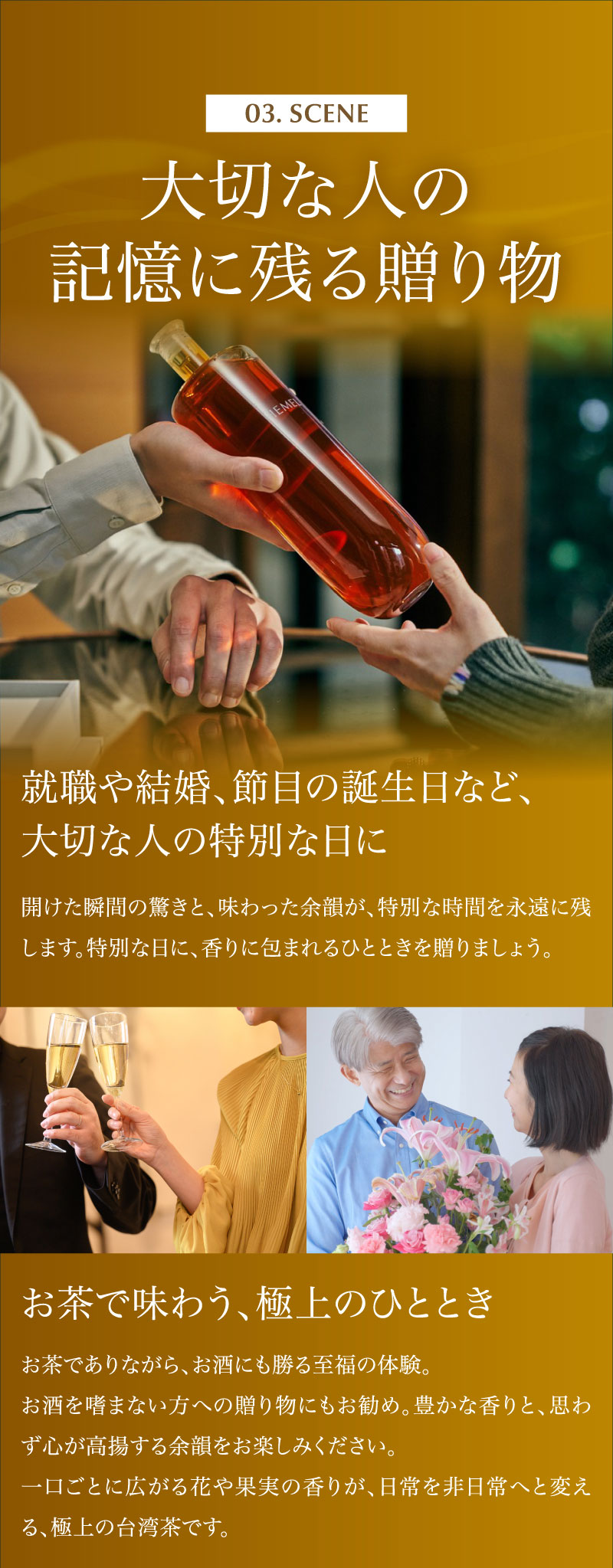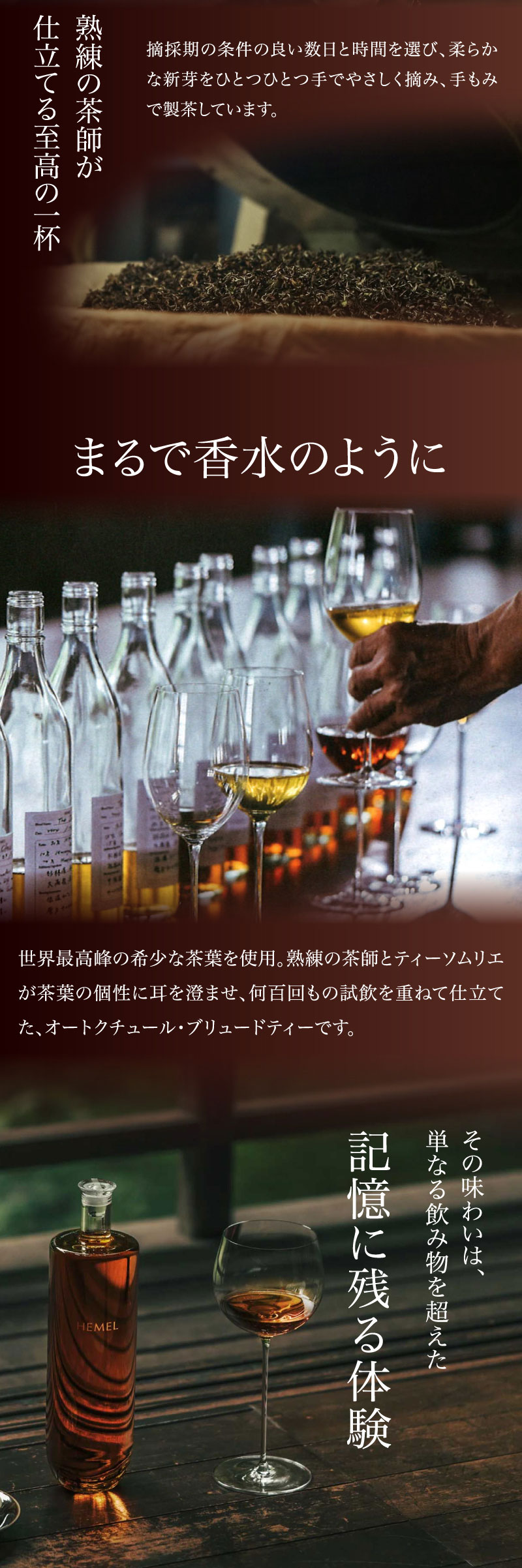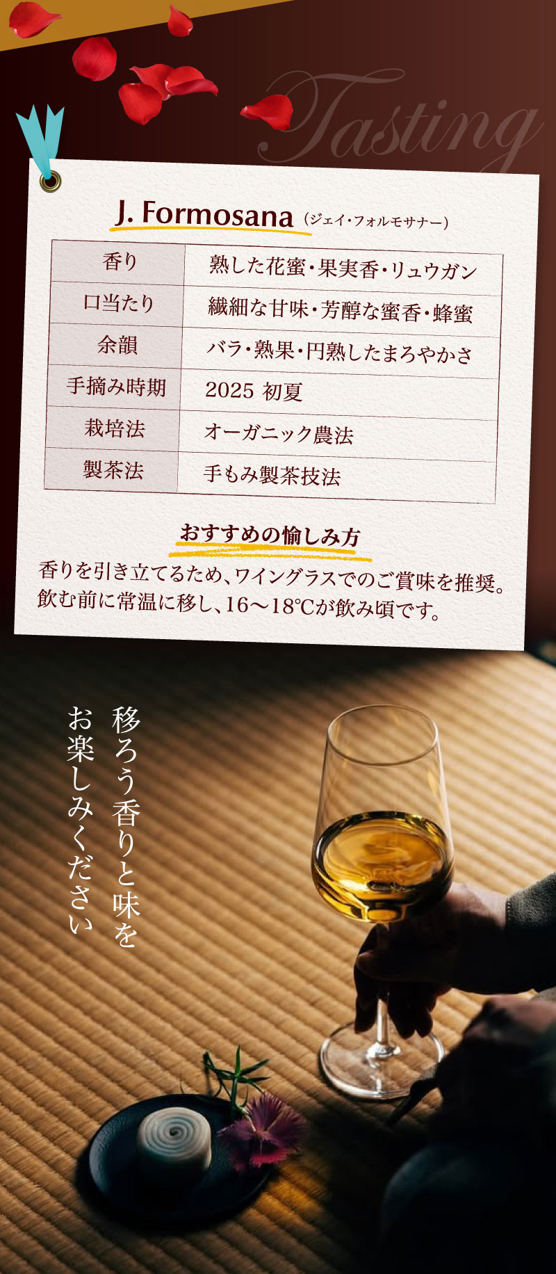 香りはまるで、上質なワイン。お酒を飲まない方にも、豊かな余韻と酔うような高揚を。茶でありながら、酒にも勝る──極上の喜びがここに。