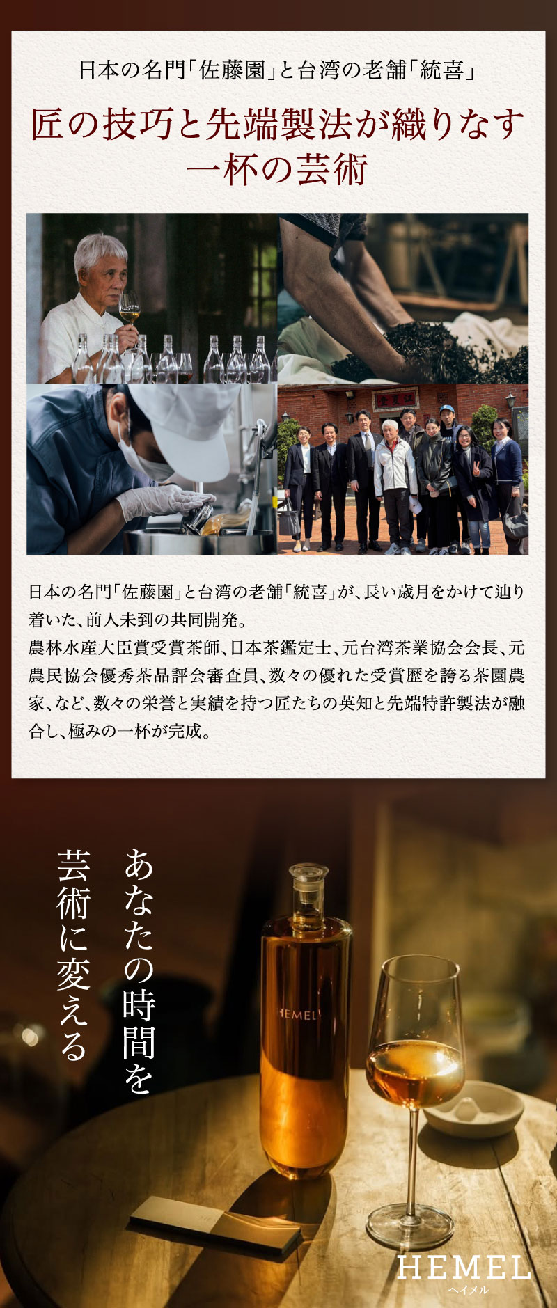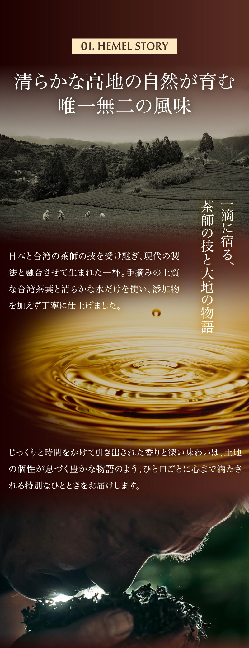 名門の茶園から選りすぐった希少な手摘み茶は、熟練した台湾の職人や茶師の五感と手によって芸術的にブレンドされ、144~192時間にもわたる丹念な抽出工程を経て、最上質な手摘み茶葉の個性が最大限に引き出されます。その結果として生まれるのは、緻密な手仕事によって創り出された至高の体験です。