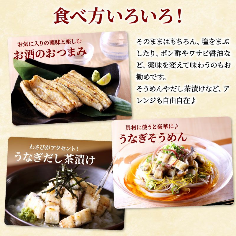 厳選された国内産のうなぎを使用し、そのままの美味しさを最大限に引き出しています。 湯せんで温めるだけの簡単調理!塩やワサビ醤油などをつけて食べると、さっぱりした美味しさをお楽しみいただけます。お酒のおつまみにもお勧め。