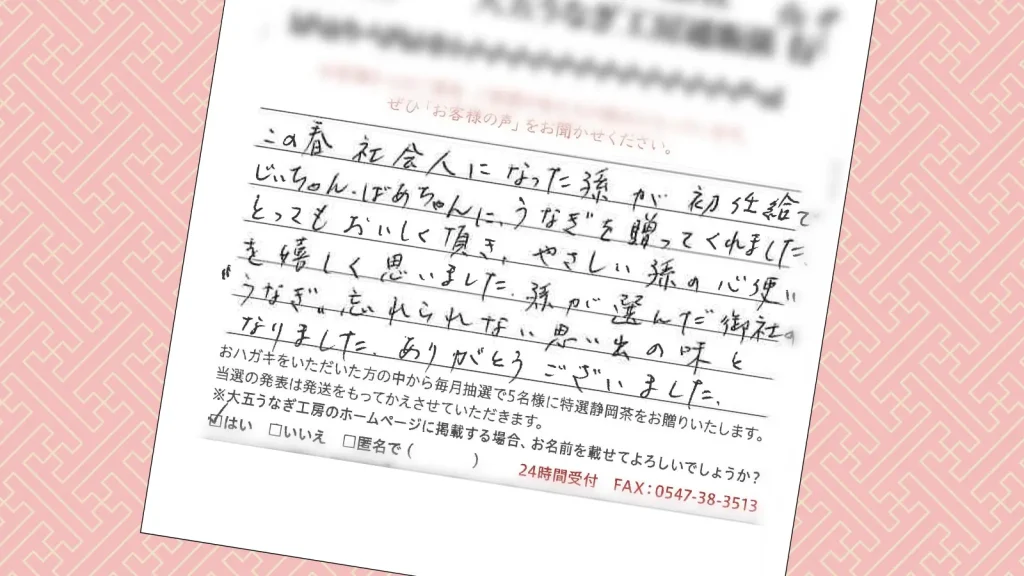 社会人になった孫が初任給で、御社のうなぎを選んでくれました。(匿名 さま)