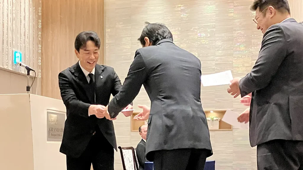 入社式後には、昨年グループとなった「株式会社佐藤園」との合同懇親会も賑やかに開催され、社員同士が互いに自己紹介を交わし、和やかな会話や笑顔があふれました。終盤には、全員に何かが当たる「大五&佐藤園 合同くじ引き大会」や、社長企画の「大ジャンケン大会」が行われ、会場は大いに盛り上がりました。