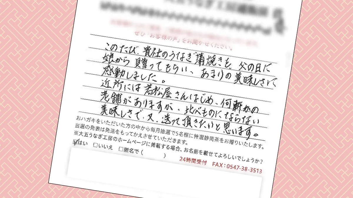 このたび、貴社のうなぎ蒲焼きを、父の日に娘から贈ってもらい、あまりの美味しさに感動しました。