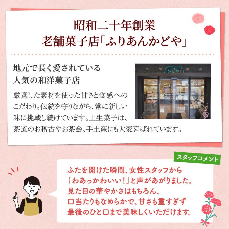 他の画像を見る 職人が1つ1つ手作りした、カーネーションをかたどった上生菓子と高級静岡茶・母の日限定ギフト 【母の日ギフト】上生菓子 花ふわりと高級静岡茶セット 化粧箱付 送料無料 母の日 クール便でお届け 通常価格 ¥ 4,390 のところ 母の日早割価格 ¥ 3,950 税込 詳細を見る お気に入りに登録する