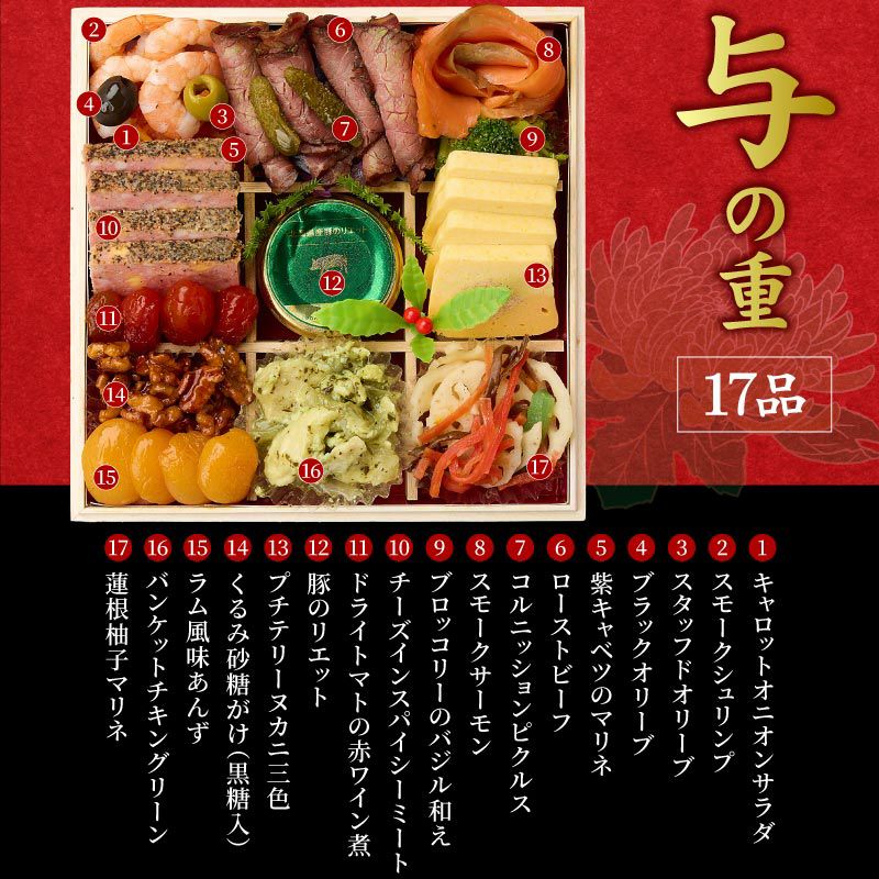 他の画像を見る 祇おん江口監修の華やかな4段 和洋おせち 2026おせち 祇おん江口監修 「慶雲」 与段重 4人前 6.5寸 化粧箱付 風呂敷包 送料無料 代引き不可 日時指定不可 クール便でお届け 通常価格 ¥ 30,240 税込 在庫切れ 詳細を見る お気に入りに登録する